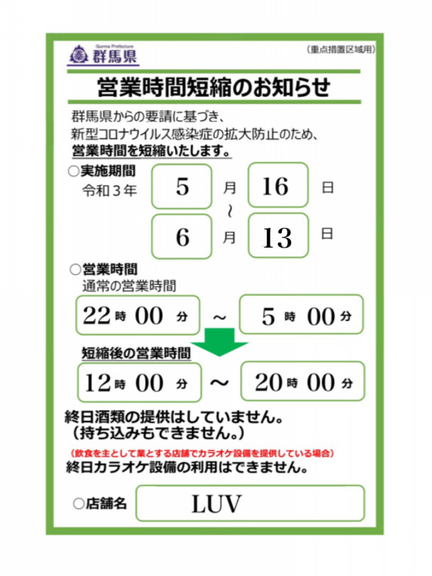 群馬県伊勢崎市がまん延防止等重点措置に基づく要請の為 6 13まで夜のクラブイベントはお休みさせて頂きます Club Luv伊勢崎